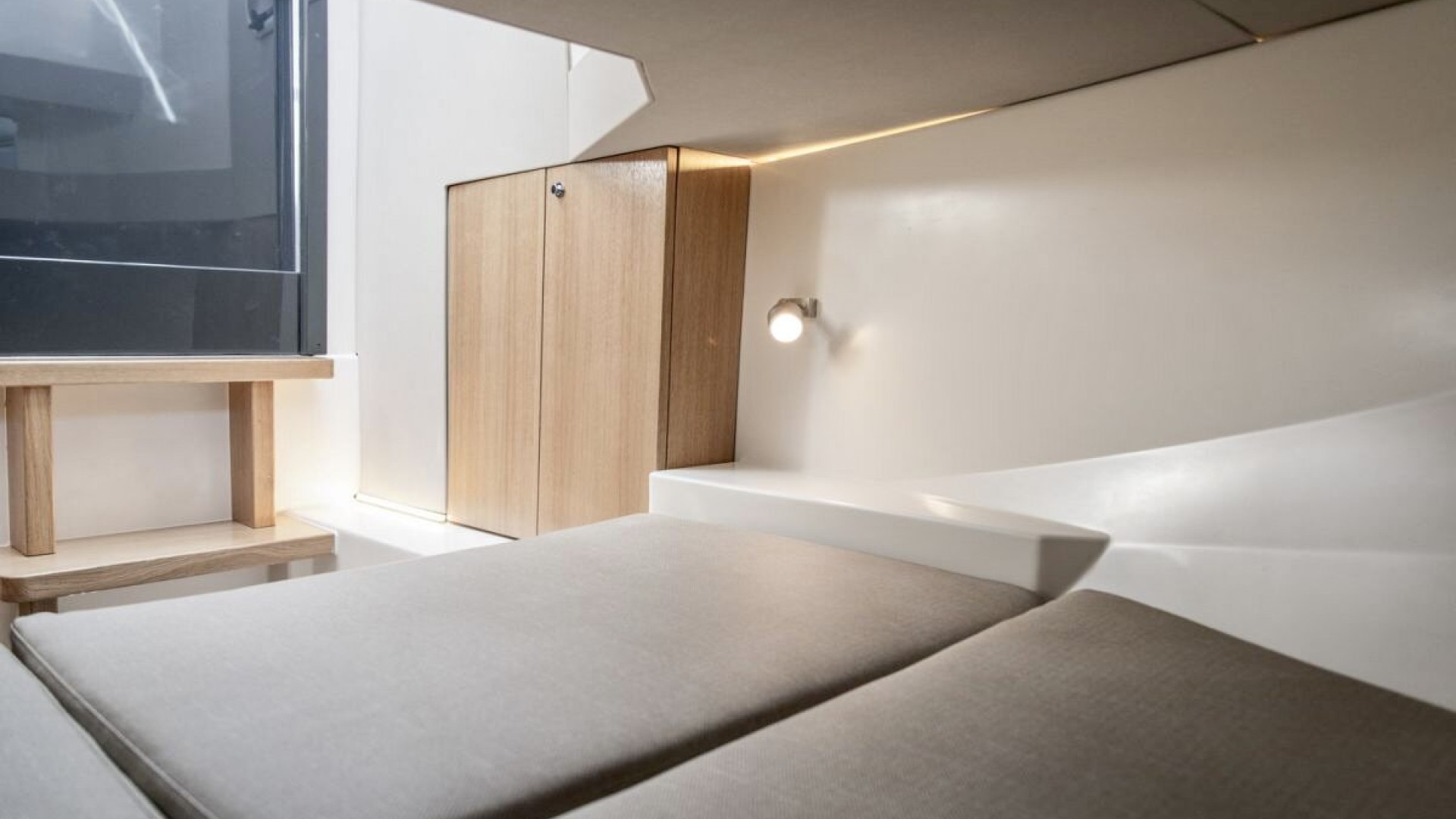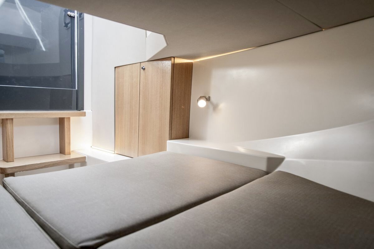 Refugio de Lujo Interior: A diferencia de otras lanchas de su categoría, esconde una cabina minimalista con una cama doble de generosas dimensiones y un baño completo con altura suficiente para estar de pie, ofreciendo privacidad y descanso real.