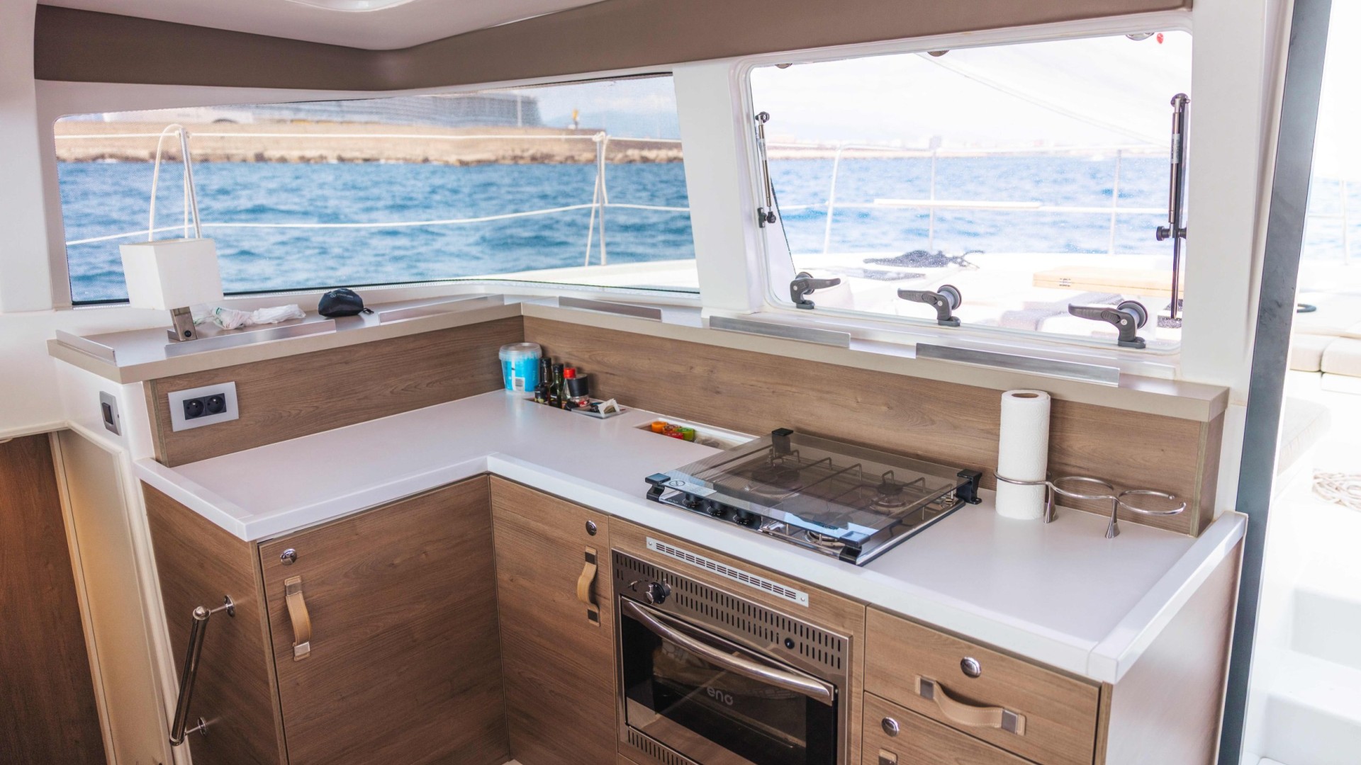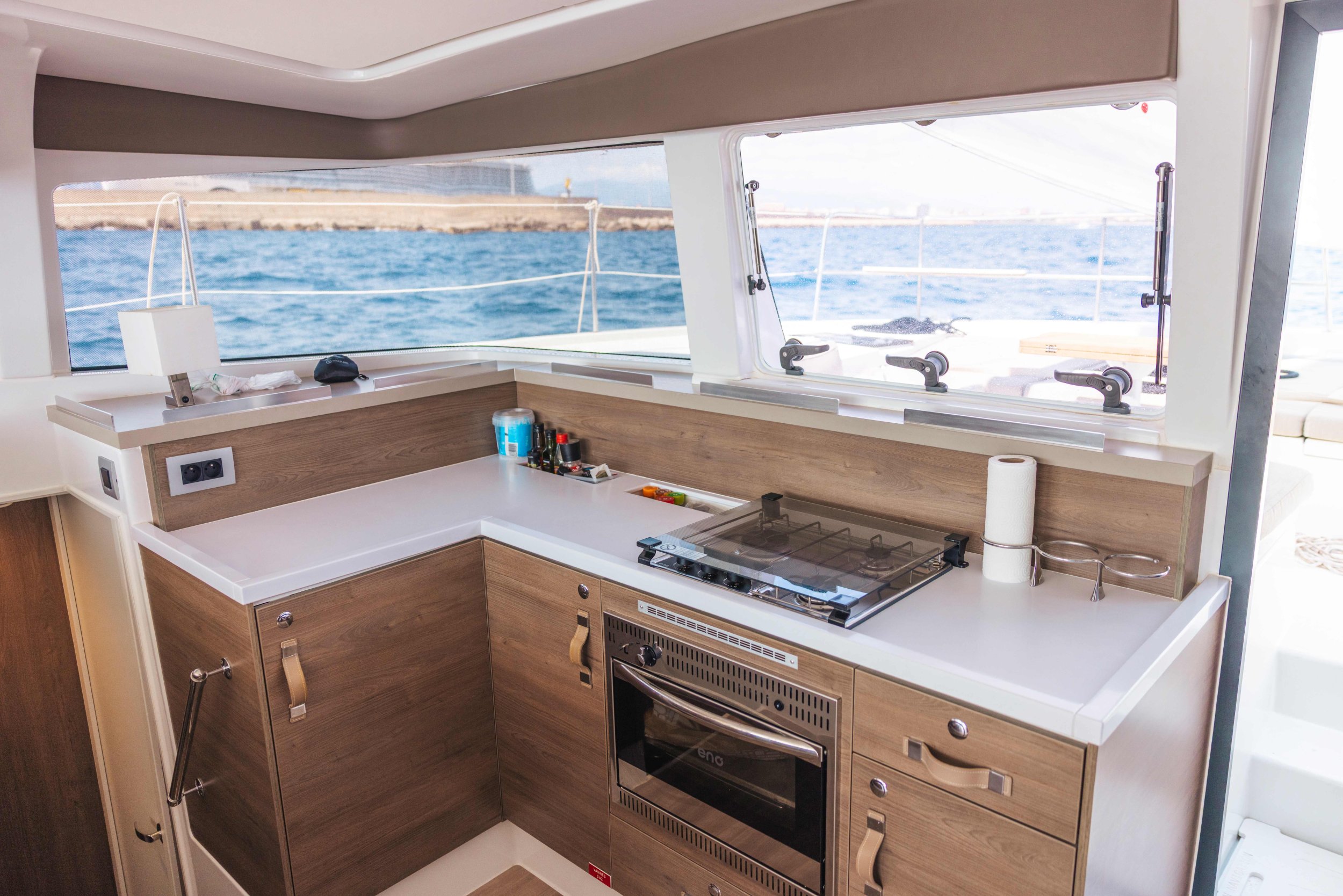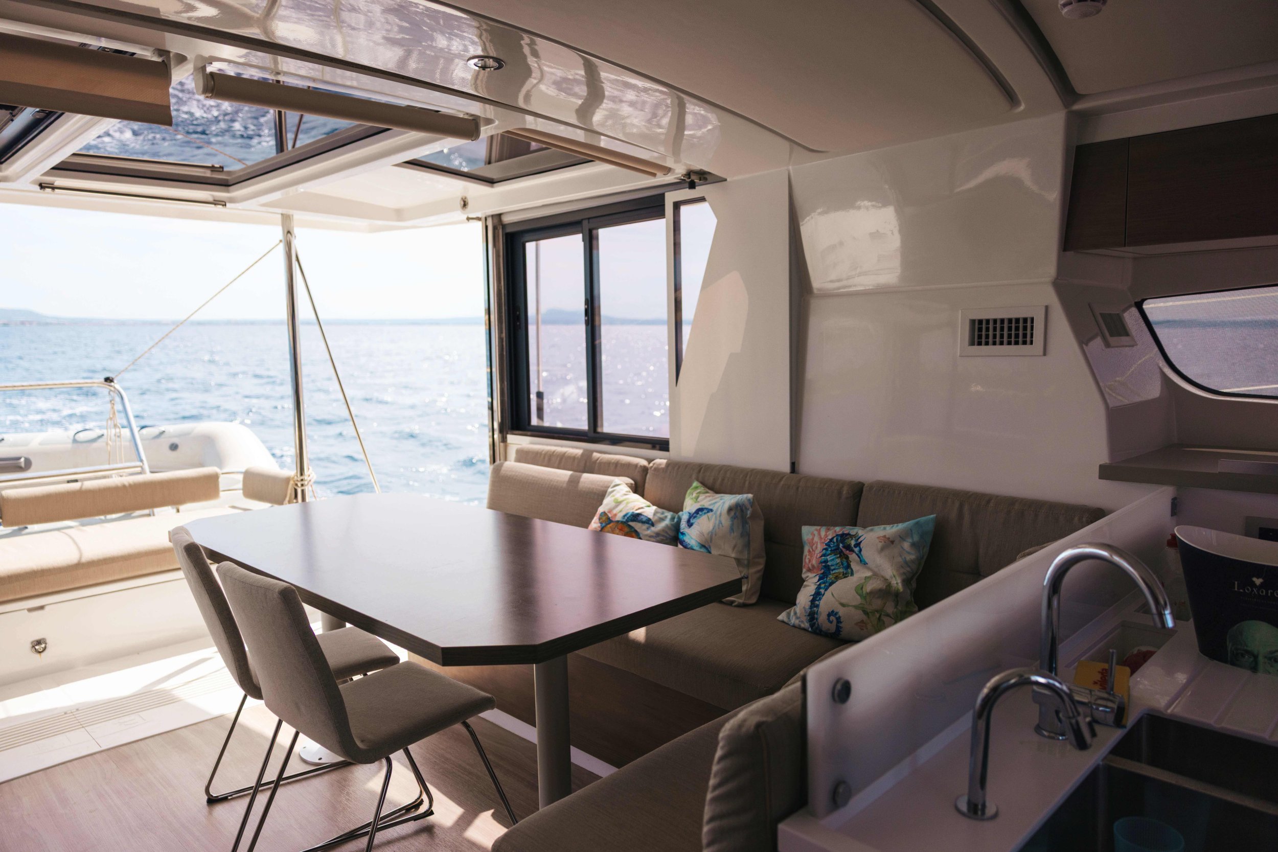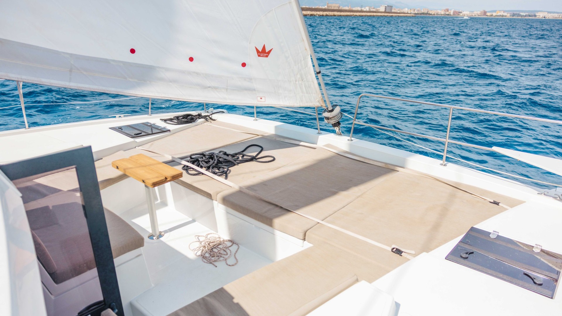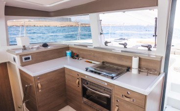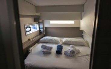 Pont de Proue Rigide avec Accès Direct : Contrairement aux autres catamarans, le Bali 4.2 remplace le trampoline par une plateforme de relaxation rigide. De plus, il dispose d’une porte avant vitrée reliant directement le carré au bain de soleil avant, facilitant une circulation fluide.
