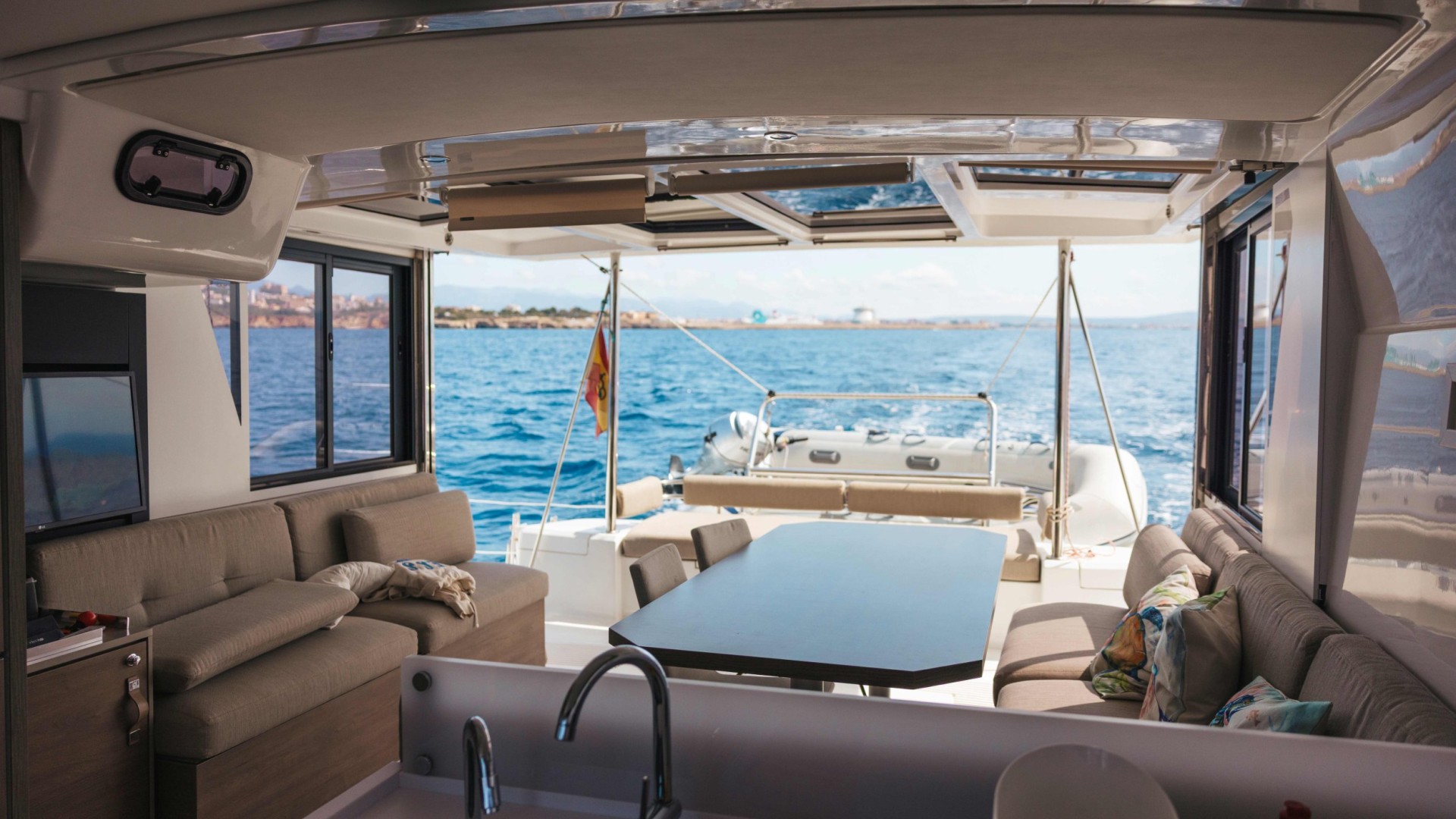 Porte « Garage » Basculante : Le carré et le cockpit arrière fusionnent sur un seul niveau en quelques secondes grâce à son emblématique porte arrière électrique. Vous profiterez d’un espace ouvert et ventilé, parfait pour des dîners au coucher du soleil face à Es Vedrà.