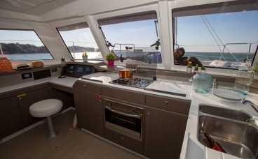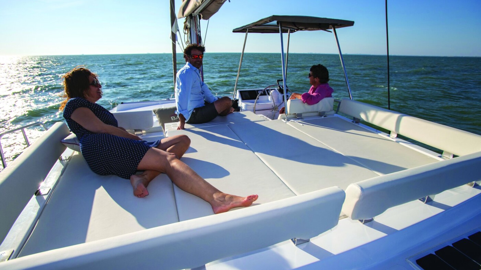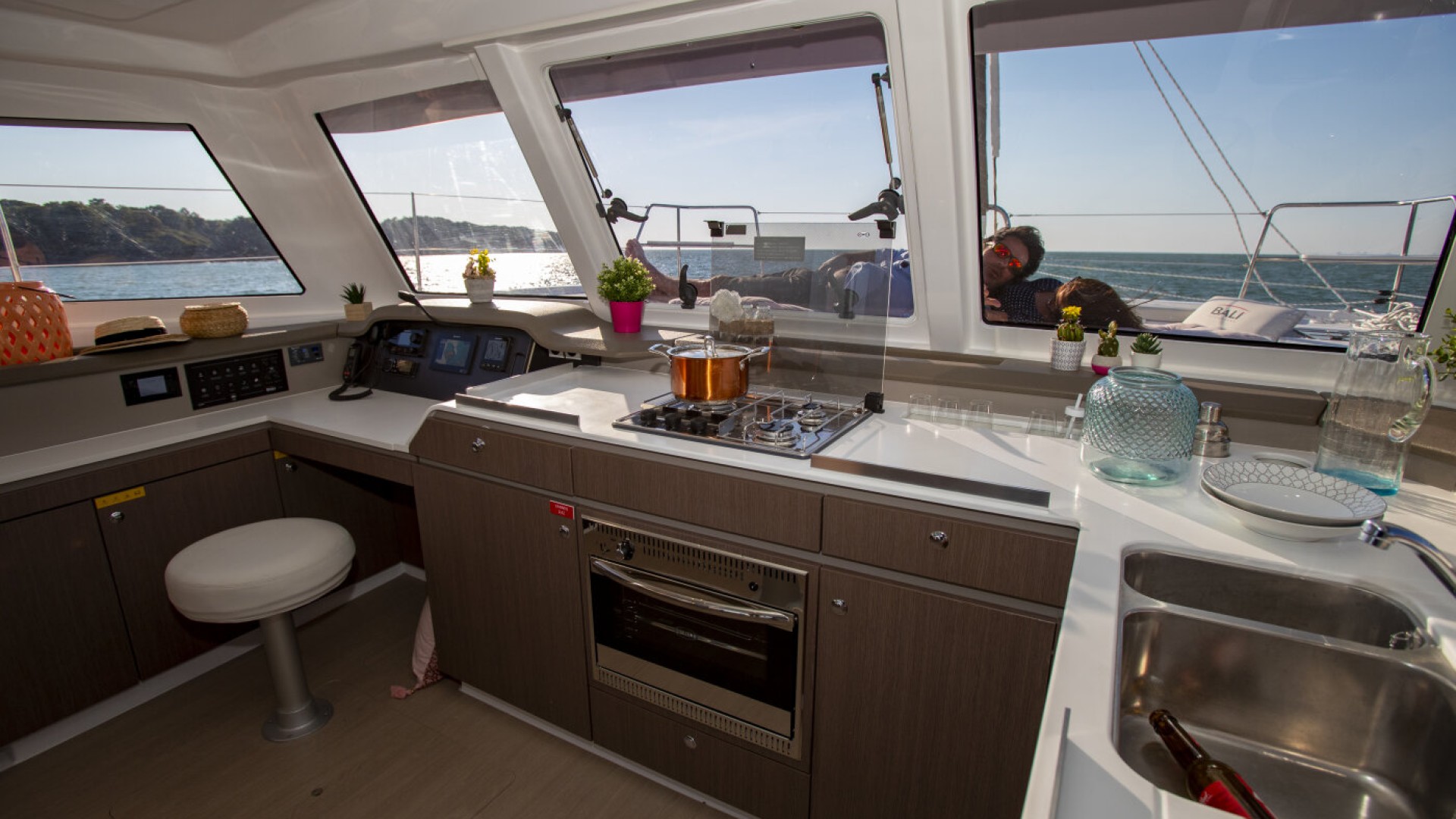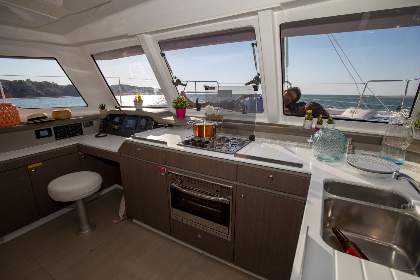 Zone de Détente Totale: Sa proue n’est pas équipée d’un filet, mais d’un pont rigide avec bain de soleil et coin salon, idéal pour savourer un cocktail au coucher du soleil tout en profitant de la brise.