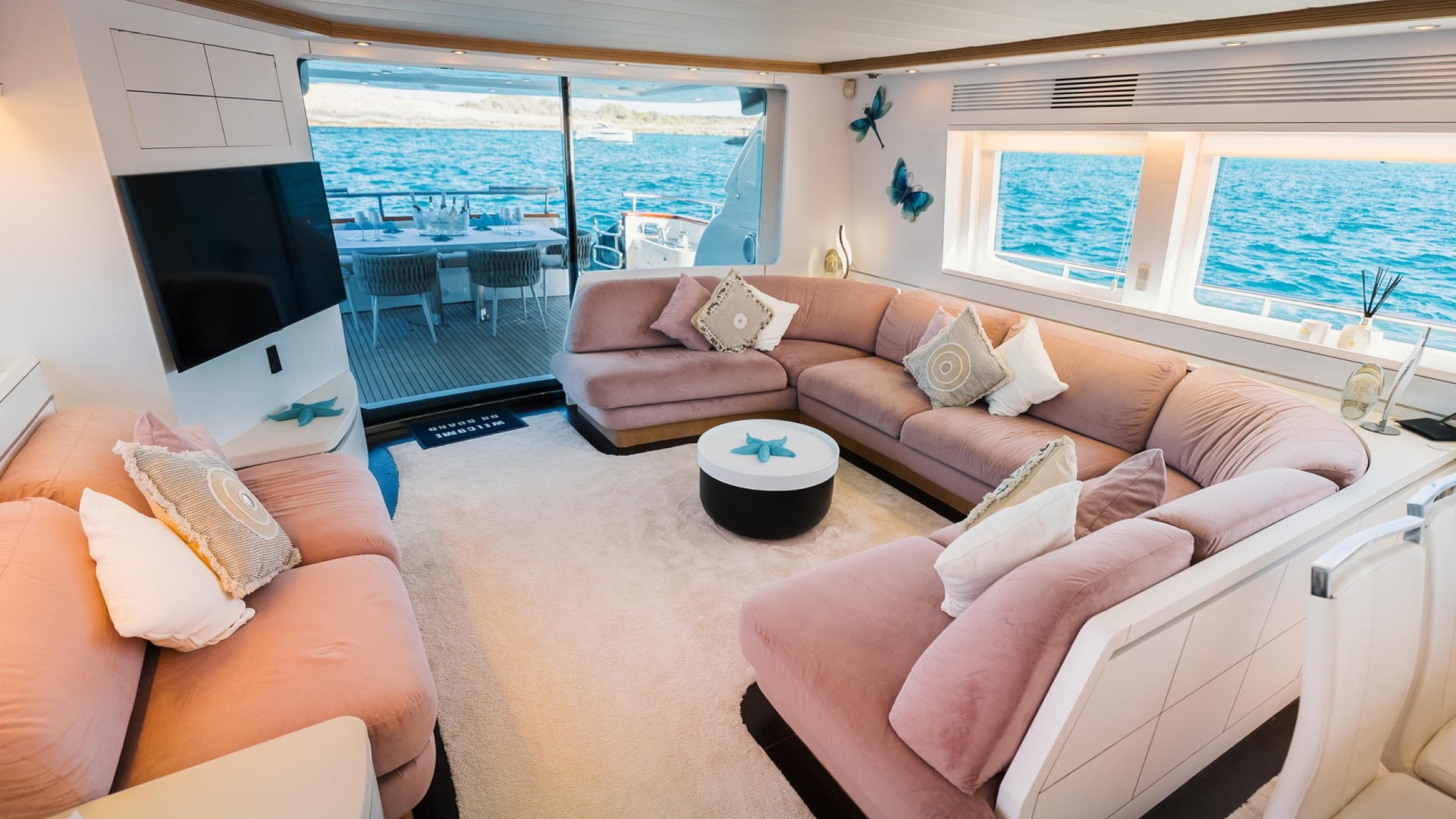 Design Intérieur Pur : Le salon principal se distingue par ses baies vitrées panoramiques et son mobilier en velours aux tons poudrés. Il dispose de 4 cabines luxueuses (3 doubles et 1 twin avec une couchette supplémentaire), permettant d’accueillir 9 invités pour la nuit en tout confort.