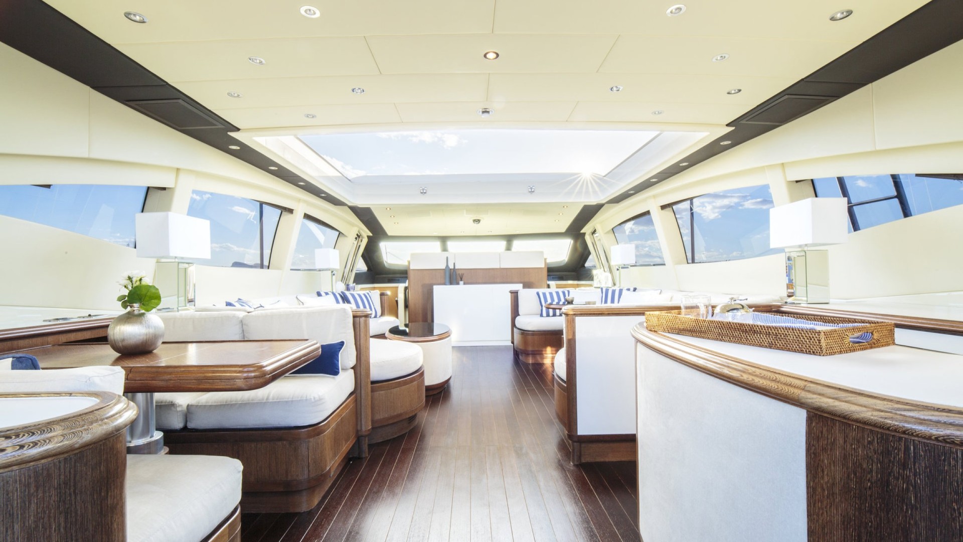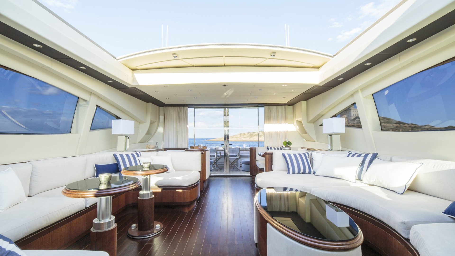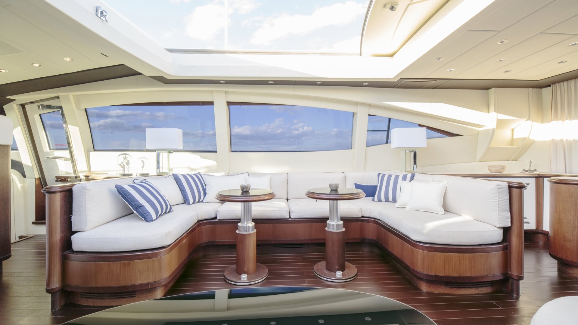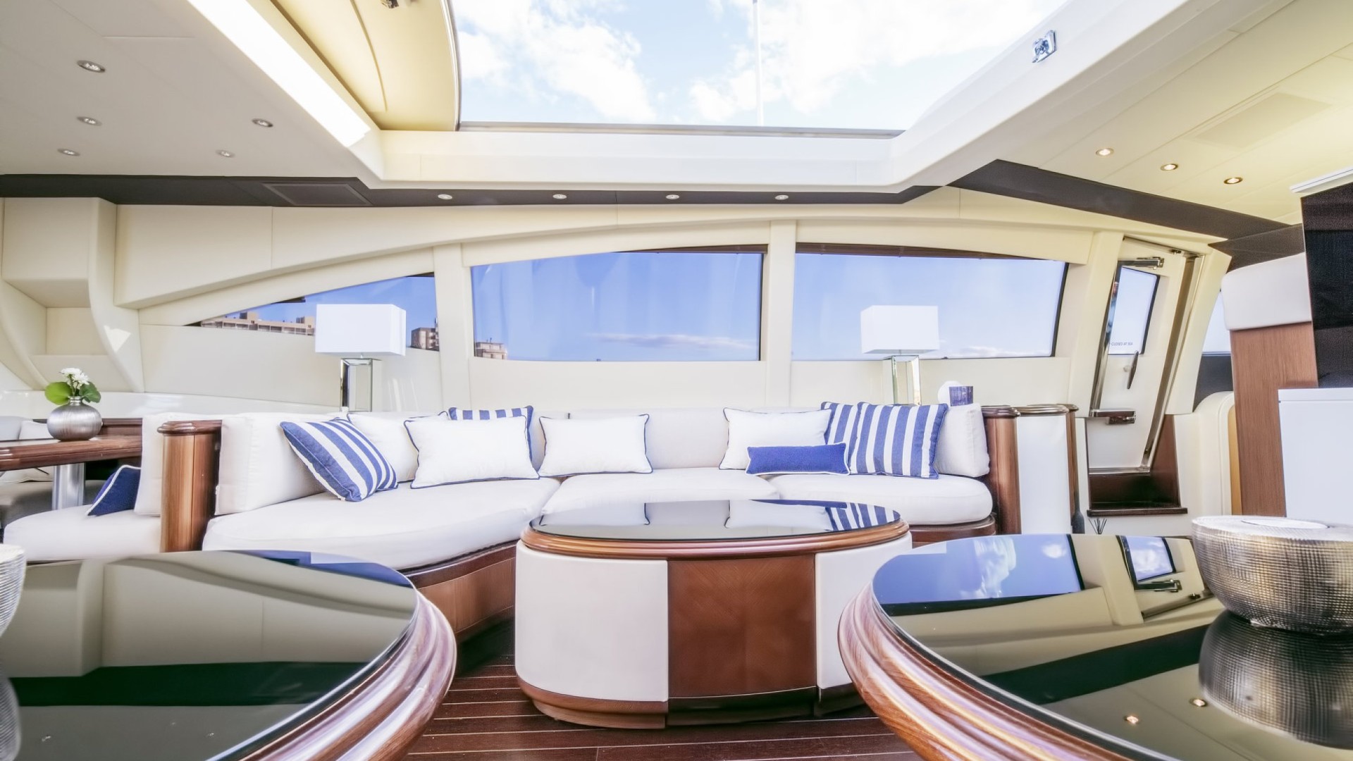 Salon avec Toit Rétractable : Le cœur du yacht est un salon baigné de lumière naturelle grâce à son toit ouvrant, permettant de profiter de la brise marine tout en se relaxant dans des canapés design ou en savourant un cocktail au bar privé.