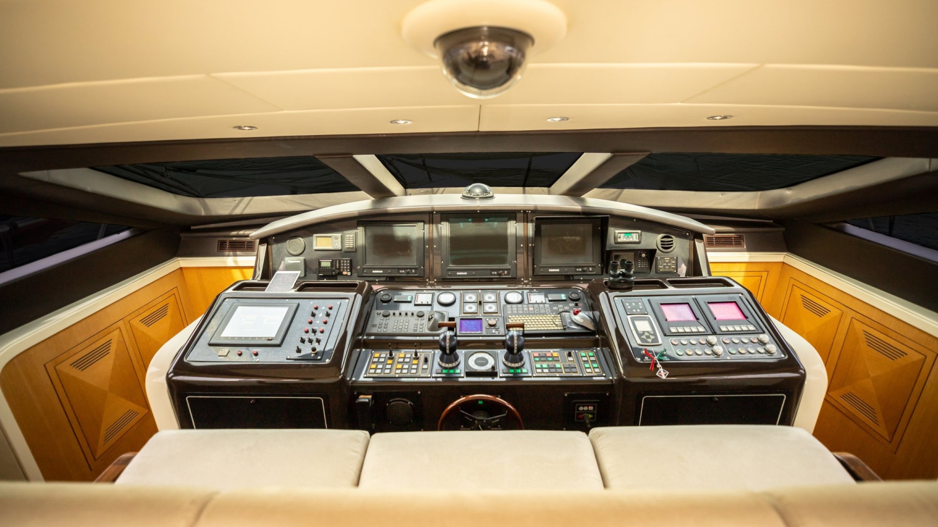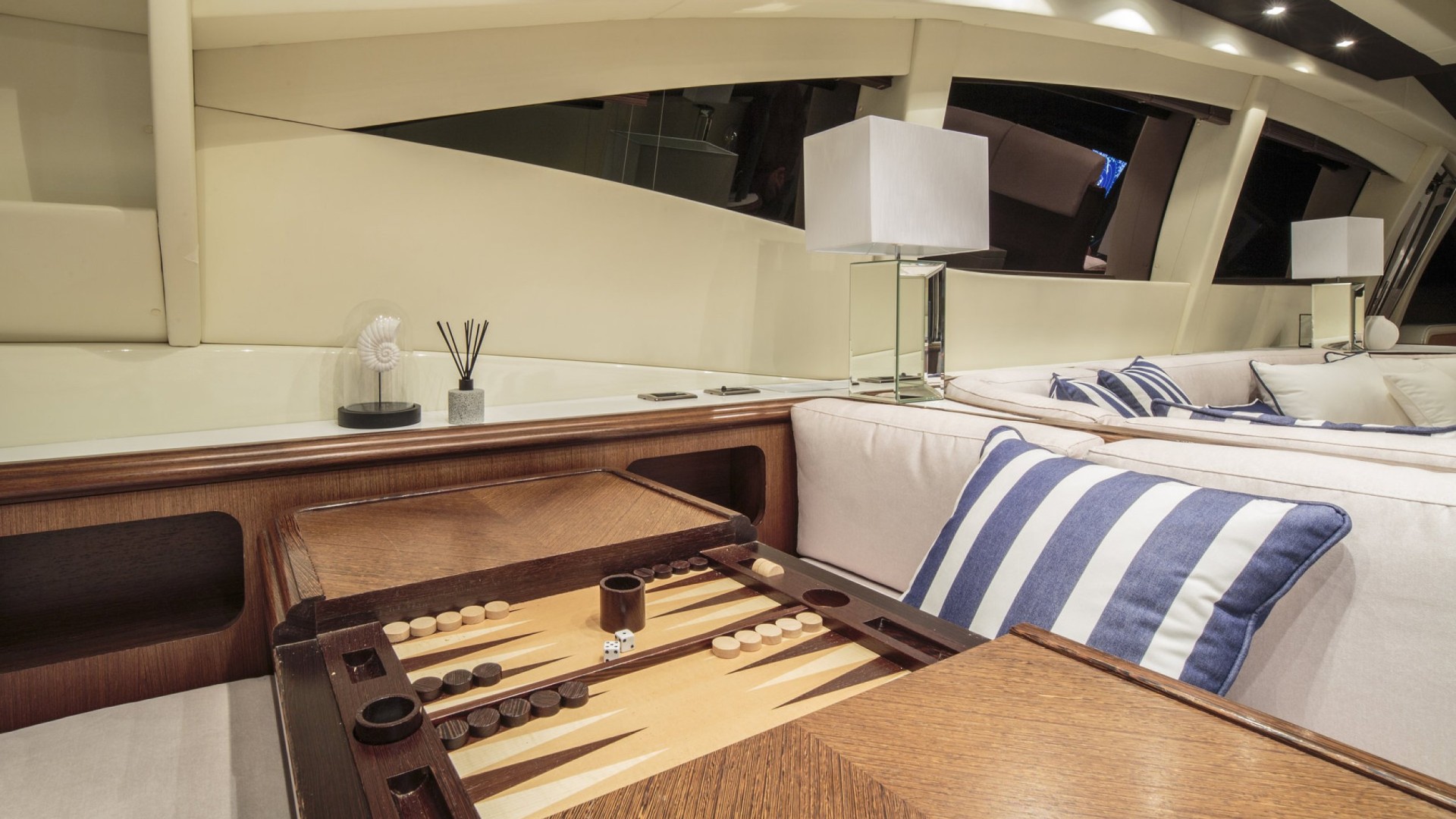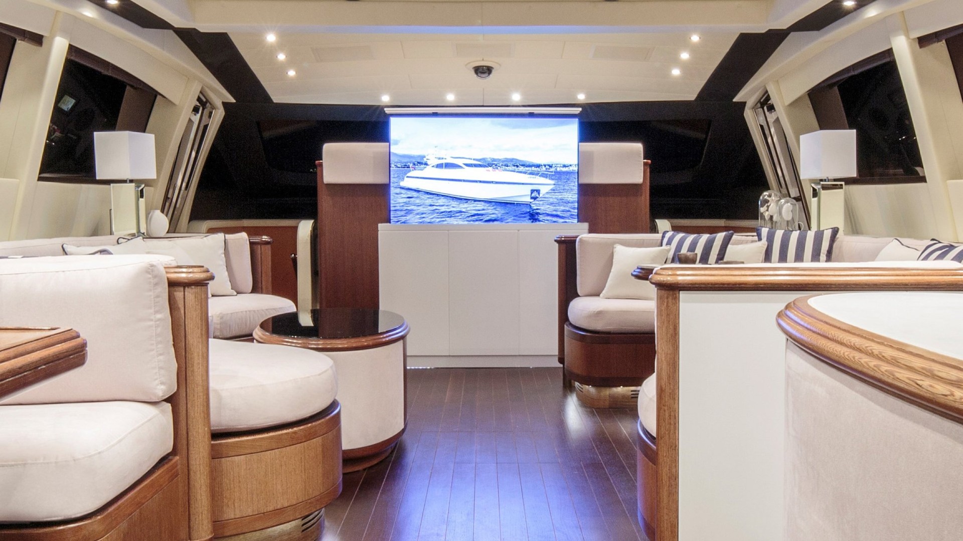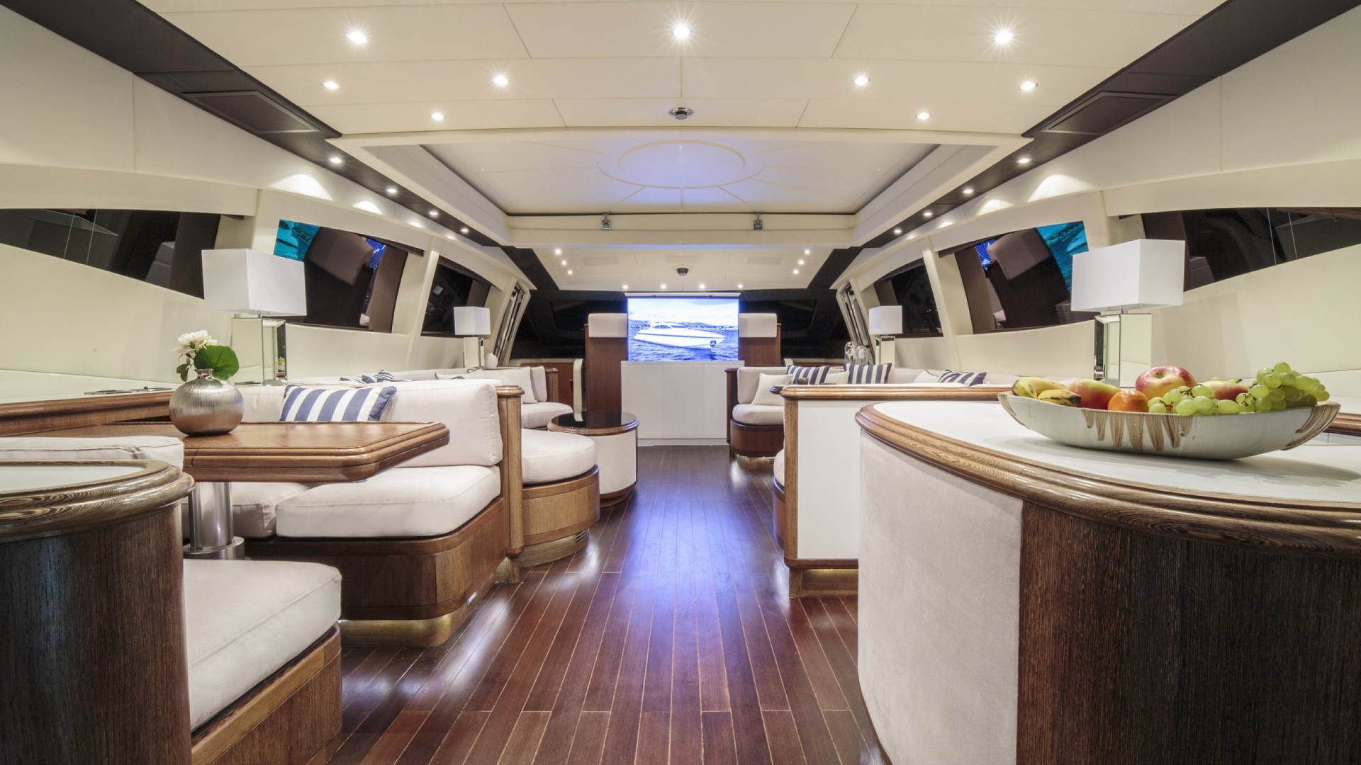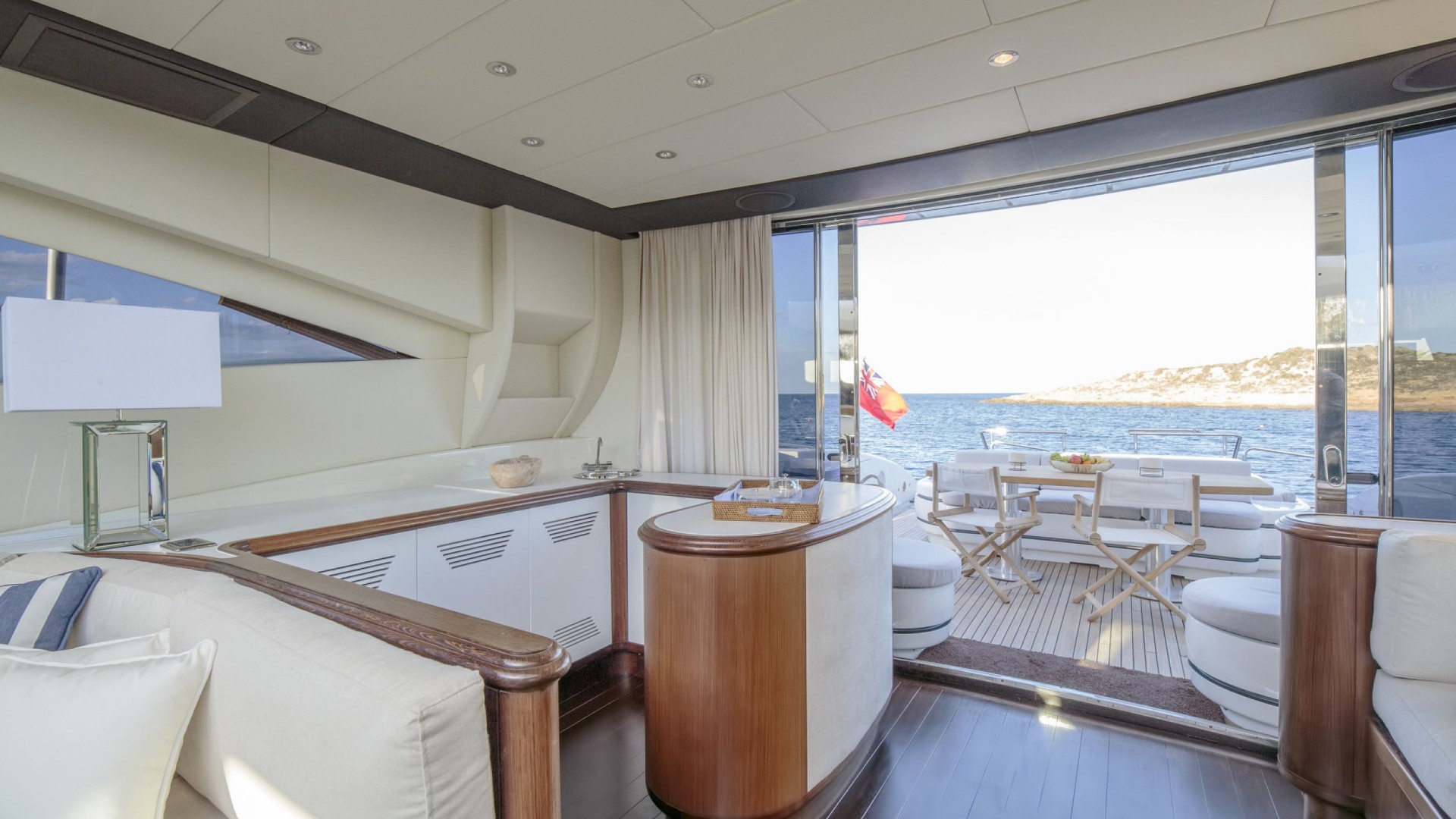 Salon avec Toit Rétractable : Le cœur du yacht est un salon baigné de lumière naturelle grâce à son toit ouvrant, permettant de profiter de la brise marine tout en se relaxant dans des canapés design ou en savourant un cocktail au bar privé.