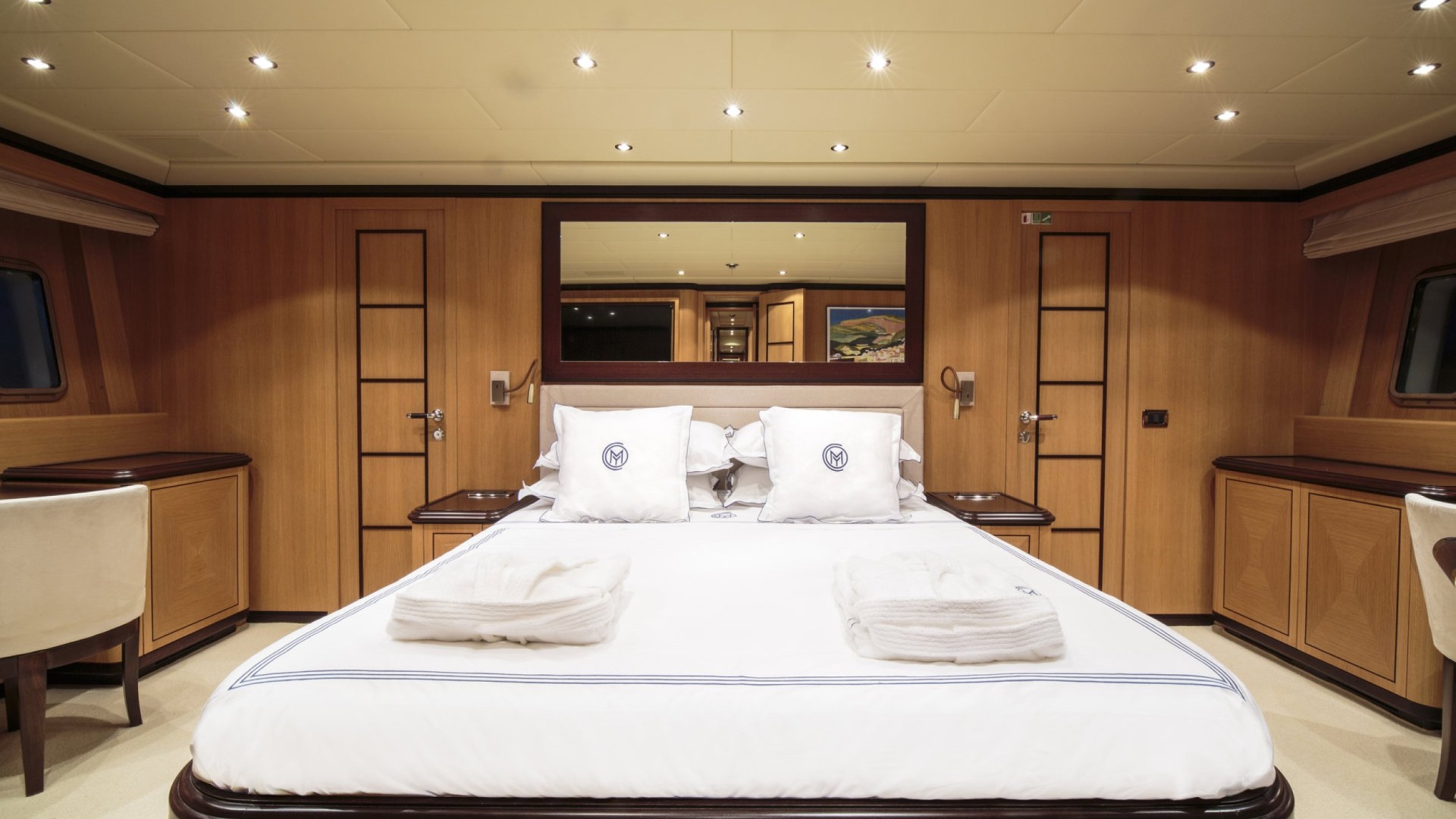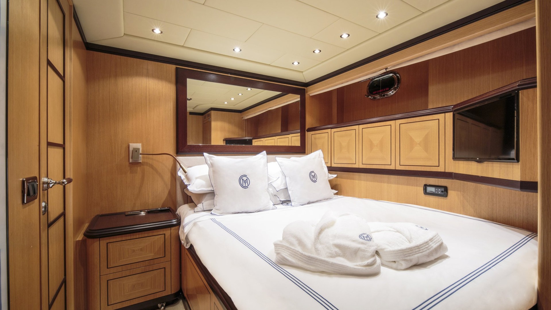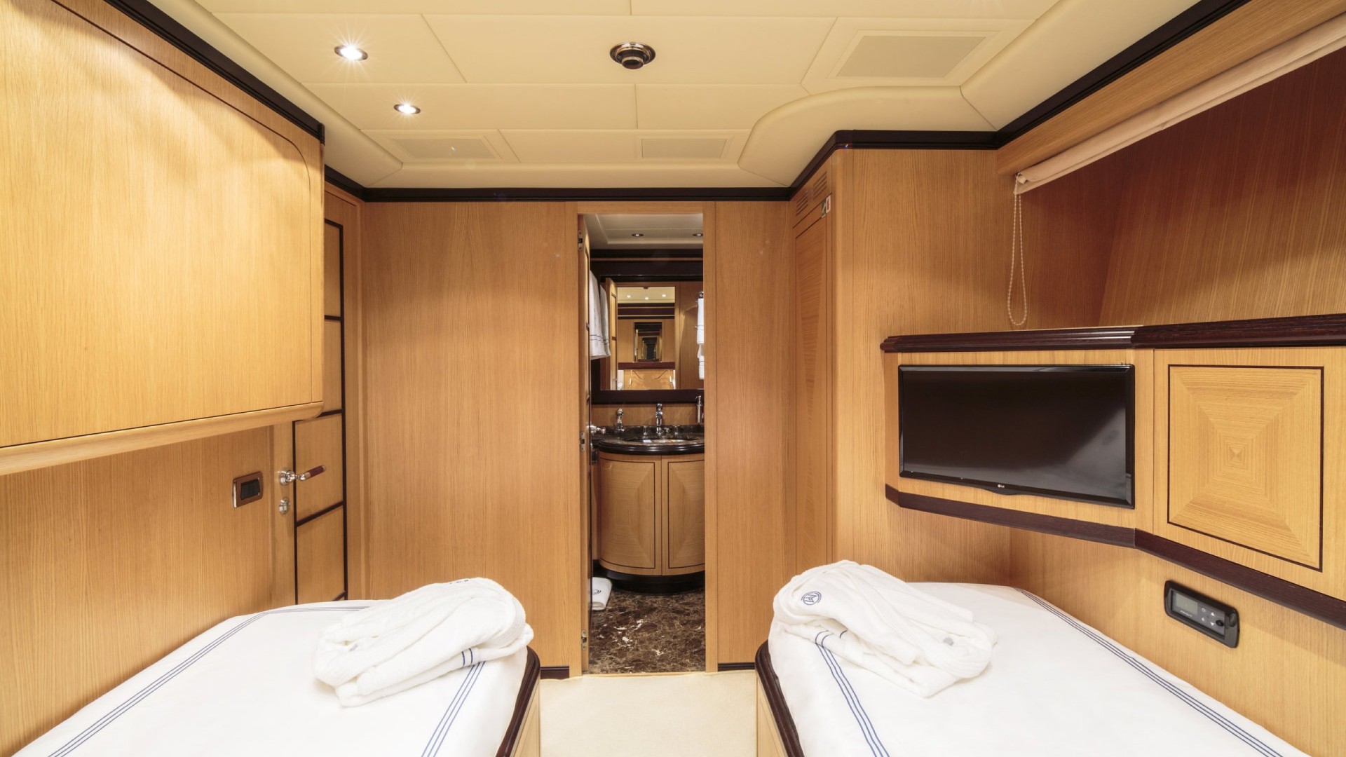 Suite Master avec Sauna : L’hébergement est de premier ordre, notamment une cabine Master sur toute la largeur (full-beam) qui comprend son propre sauna privé et un dressing, un oasis de bien-être rare sur des unités de cette longueur.