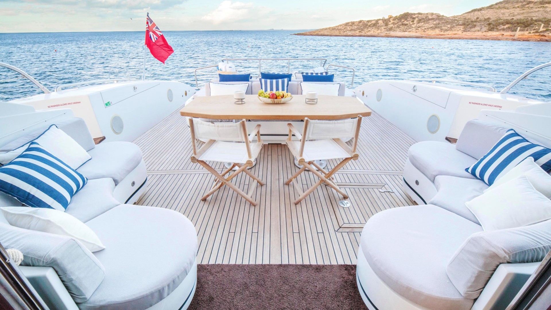 Polyvalence Extérieure : Il dispose de trois zones de bain de soleil indépendantes : un large pont arrière avec une table pour huit convives, une proue privée avec des tauds extensibles et un flybridge supérieur pour ceux qui recherchent une discrétion totale sous le soleil.