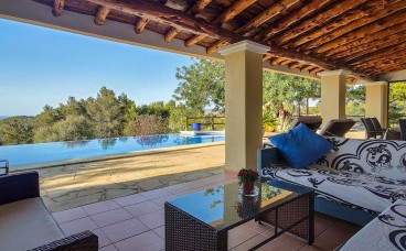 À l’extérieur, profitez de vues imprenables sur la campagne, les montagnes et la mer. La maison dispose de deux porches, parfaits pour se détendre et profiter du paysage. La piscine à débordement est un luxe, entourée d’une grande terrasse, de chaises longues et d’un caroubier offrant de l’ombre. Les équipements complémentaires comprennent un barbecue, la climatisation, le WIFI et un parking privé.