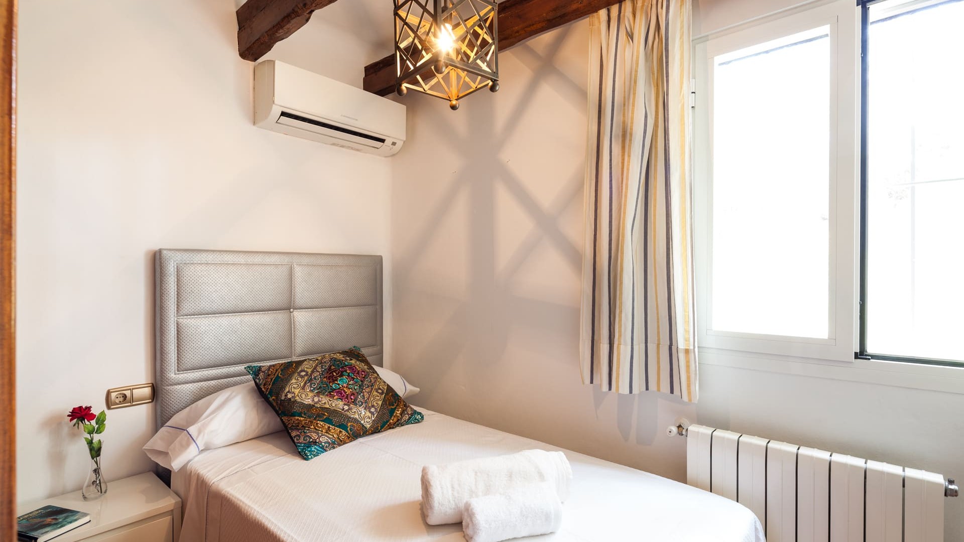 The interior features traditional sabina wood ceilings and a bright, inviting atmosphere.